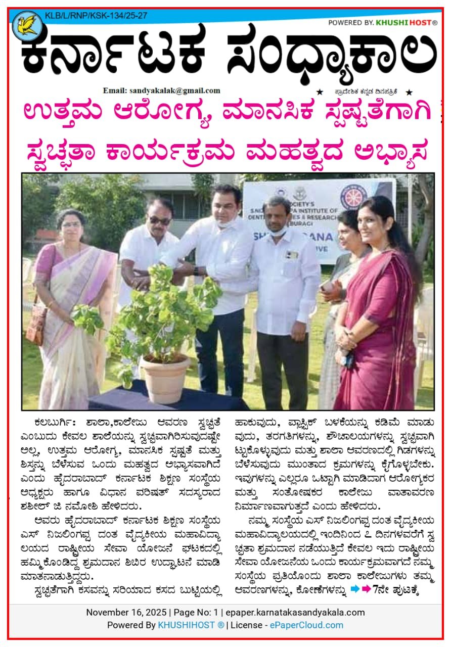 SNIDSR 2025-26 PHOTO 77th Republic Day Celebration 77th Republic Day Celebration celebrated Sankranti National Youth Day celebrates 25 Years of Graduation Donation Awareness & Sensitization Program Anti Ragging Awareness Program Shramadana Cleanliness Drive Children’s Day Celebration Prosthonexus 2025 – Virtual State-Level Masterclass in Prosthodontics Prosthonexus 2025 – Virtual State-Level Masterclass in Prosthodontics The Graduation Ceremony Women Freedom Fighters Hyderabad Karnataka Liberation Day 12th Annual Conference of AOMSI – Karnataka State Chapter 12th Annual Conference of AOMSI – KSC (pre conference) Human Factors & Patient Safety Faculty Development Program Teacher’s Day Independence Day Celebration 2025 Workshop on Integration of Orthodontic Biomechanics and Material Science IQAC Initiative Gender Sensitization and Reproductive Health Awareness Program Oral Hygiene Day 04th Birth Anniversary Celebration of Shri Mahadevappa Rampure Founder CDE Program on Forensic Odontology "Beyond the Syllabus" State Level Sensitization Program for Dental Interns CDE Program and Workshop on Restoration of Endodontically Treated Teeth Yoga Week Celebration Hastha Mudras Introduction to Shatkarmas